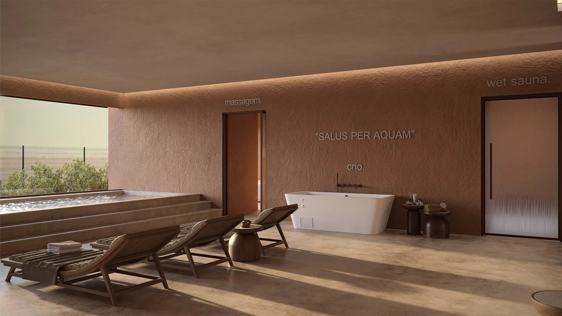 A arquitetura do Positano é uma obra de arte em si. Assinada pelo renomado arquiteto Tiziano Simonelli, ela se destaca por seus volumes marcantes, texturas naturais e o uso inteligente da luz. A inspiração marroquina-sertaneja se traduz em um design que é, ao mesmo tempo, moderno e atemporal, valorizando as formas naturais e o trabalho artesanal.
